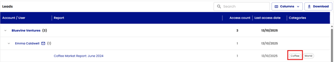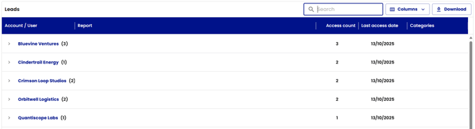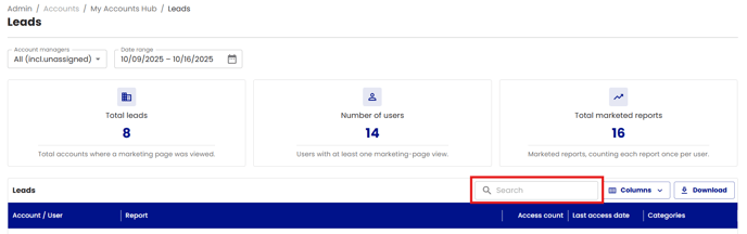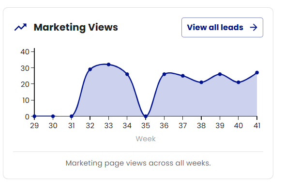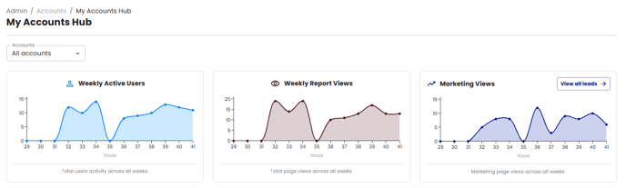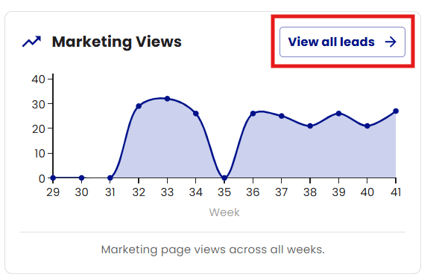 The 'Leads' page can be accessed from within the 'Account Growth Insights Email' and the Account Hub ' Weekly Marketing Views' graph.