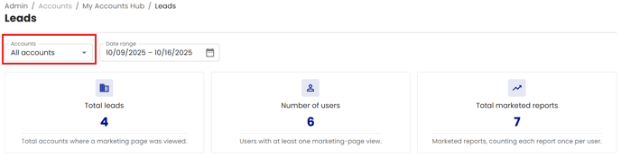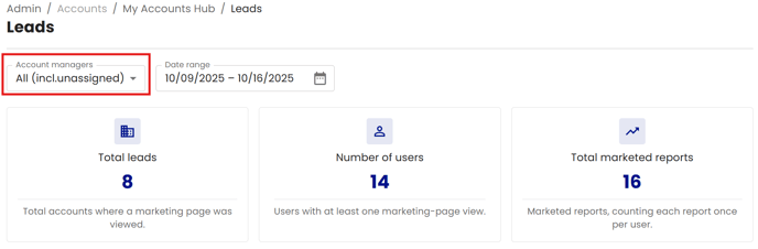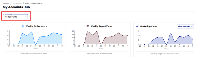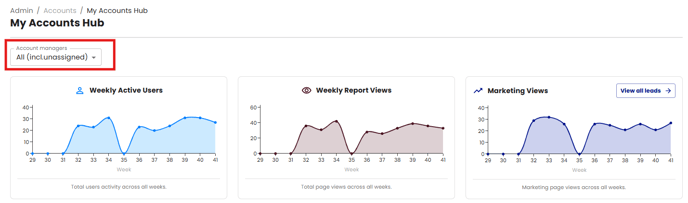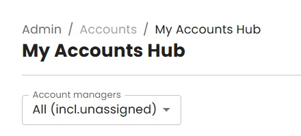 πNote: Similar to the Accounts Hub, users with 'Site Administrator' permissions will see a dropdown of account managers, and users with 'Account Manager' permissions will see a dropdown of their accounts.