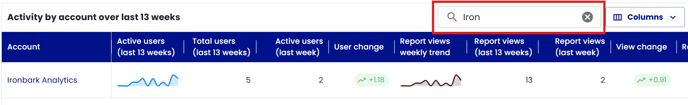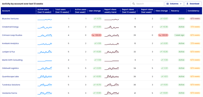 Report views: (Last 13 weeks): Displays the number of weekly report views per account.
