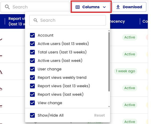 Recency: This displays when the account was last active, starting with "active" (last week) and increasing by the number of weeks ago. The colour-coded red indicates a longer time since the account was active.