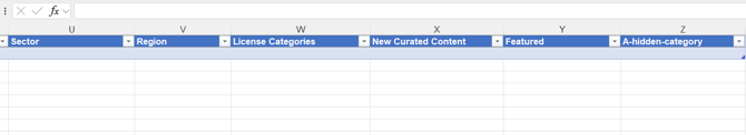 When using the export template, your site's current top-level display categories will appear as column headers.