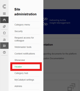 To create and configure a Category Navigator, first head to Admin > Site administration > Header.
