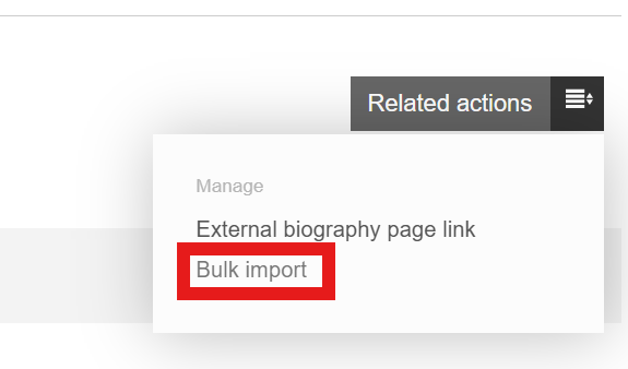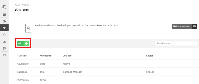 To bulk add Analysts, use the Analysts > related actions > Bulk import.