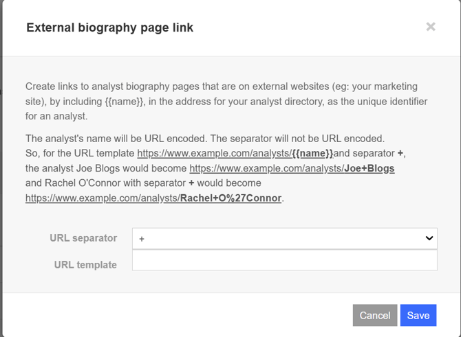 the analyst Joe Blogs would become https://www.example.com/analysts/Joe+Blogs