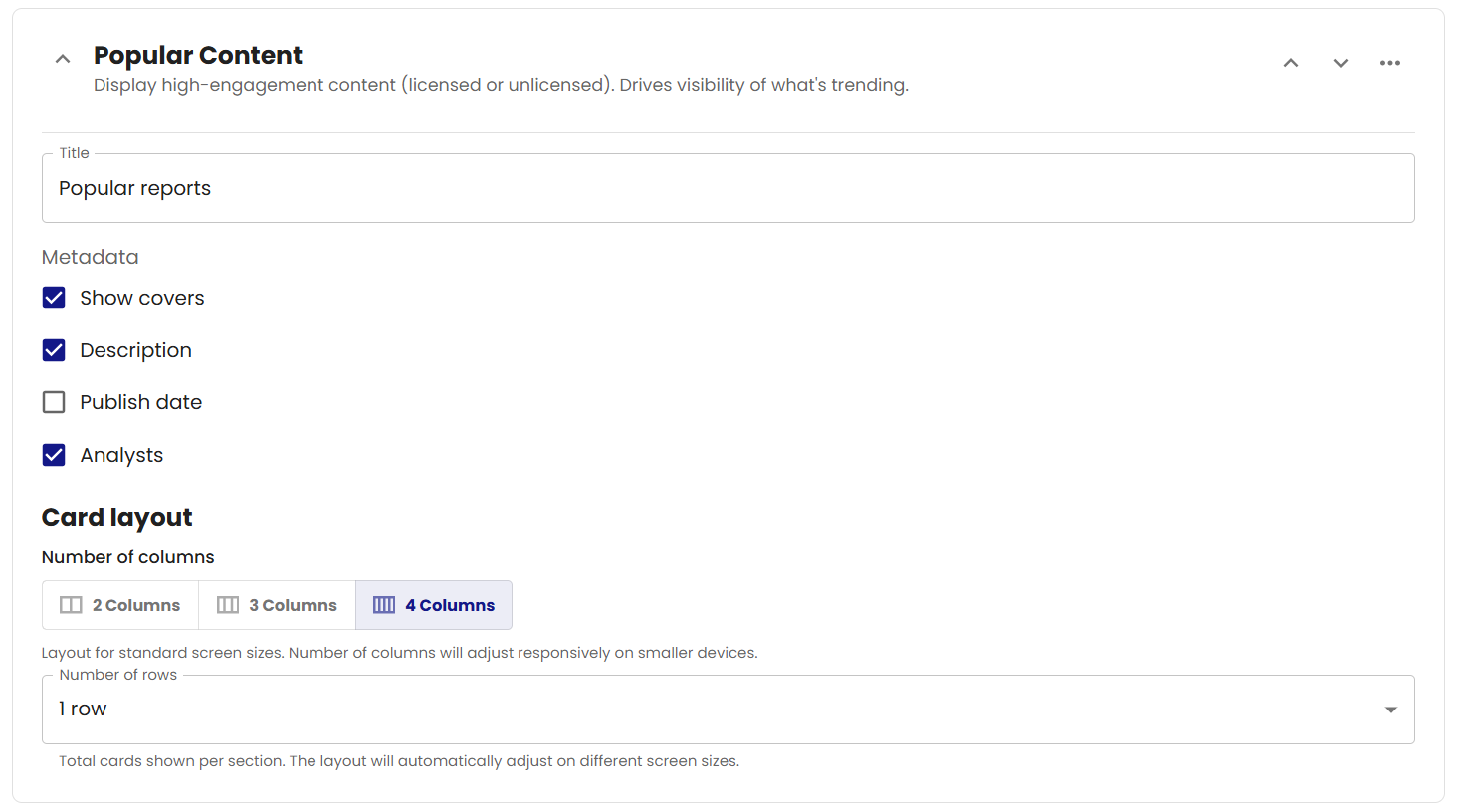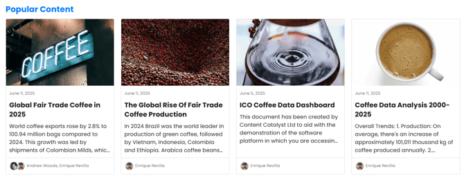 The Popular Content section highlights the most viewed and trending reports on your platform, helping users quickly find research that’s resonating with others.