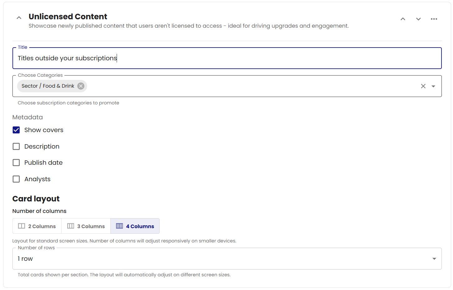 Customise the section title using the Title field. This text will appear at the top of the section—for example, Explore More, Content You May Like, or Locked Insights.