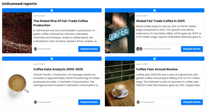 Each report will be displayed with a padlock indicating that it is unlicensed. Users can select the 'Request access' option to take them to the content landing page, depending on how this has been configured.