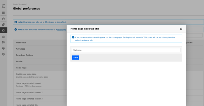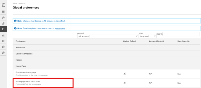 1. To edit the homepage tabs, go to the Accounts section of the admin interface and select Global Preferences.