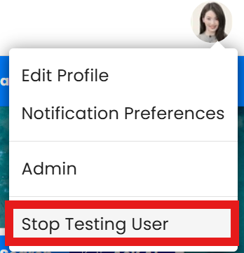 Once you have finished testing, hover over My Profile and click Stop Testing User. This will take you back to the admin page.