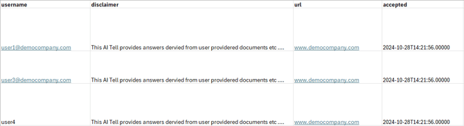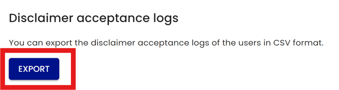 Administrators can export a CSV format list showing the users that have accepted the initial disclaimer and when.