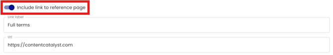 Set an optional 'Full terms' link that will be applied across multiple components, including inline disclaimers, initial disclaimer dialogs, reminder disclaimer alerts, and any AI response content copied to the clipboard.