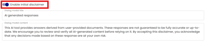 Once the 'Enable initial disclaimer' toggle is switched on, A Dialog modal title and Dialog modal content will be available. See below.