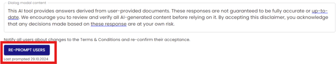 Once the initial disclaimer content has been saved and changes have been made, a further Re-Prompt Users option will be available.