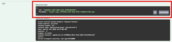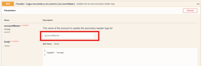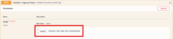 In the query 'body' section, replace the "string" value with the Image ID wrapped in quotation marks and separated by commas that you wish to add as the primary header logo.