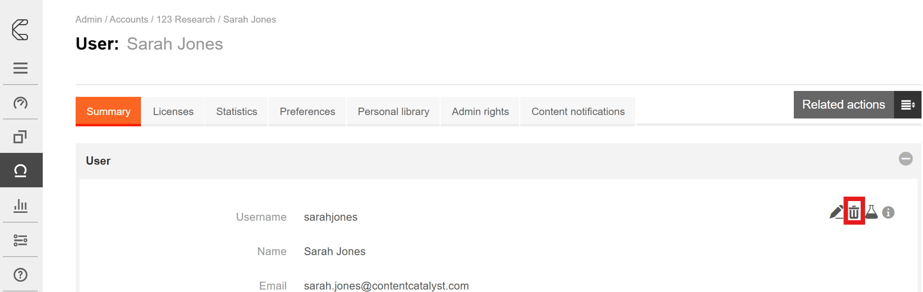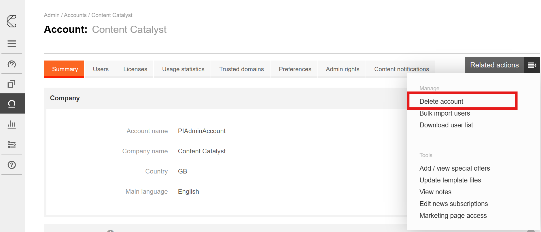 2. Click the Related Actions button on the right of the page and click Delete Account