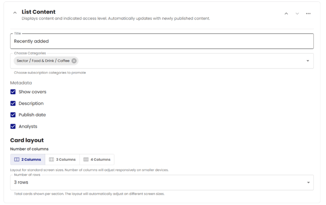 Customise the title, categories, displayed metadata, and card layout for each List Content section.