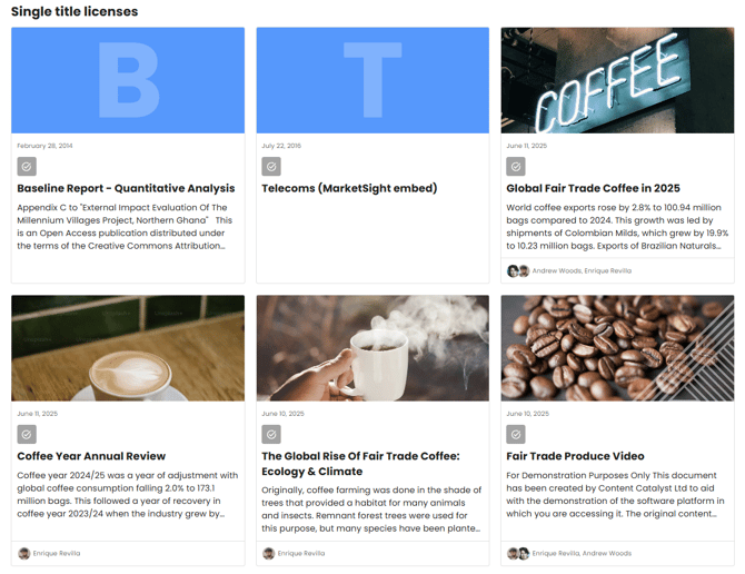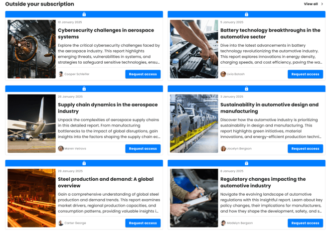 Subscribers can see the recently published single-title licensed content to which they have access. These are dynamic and responsive to their license, ensuring a continually updated, personalised experience. Choose to configure metadata to display report titles, analyst author names, publication dates, and more, offering key information at a glance.